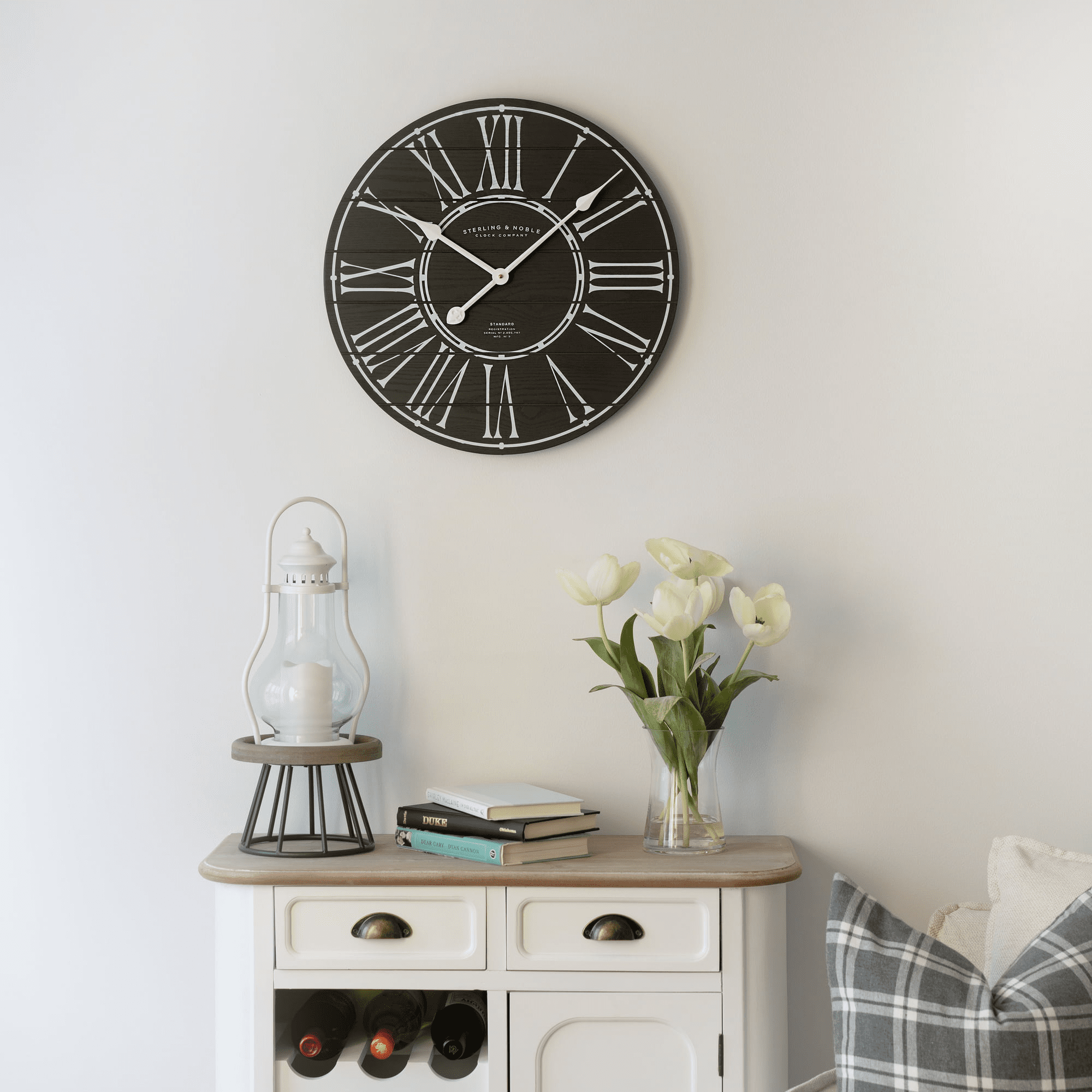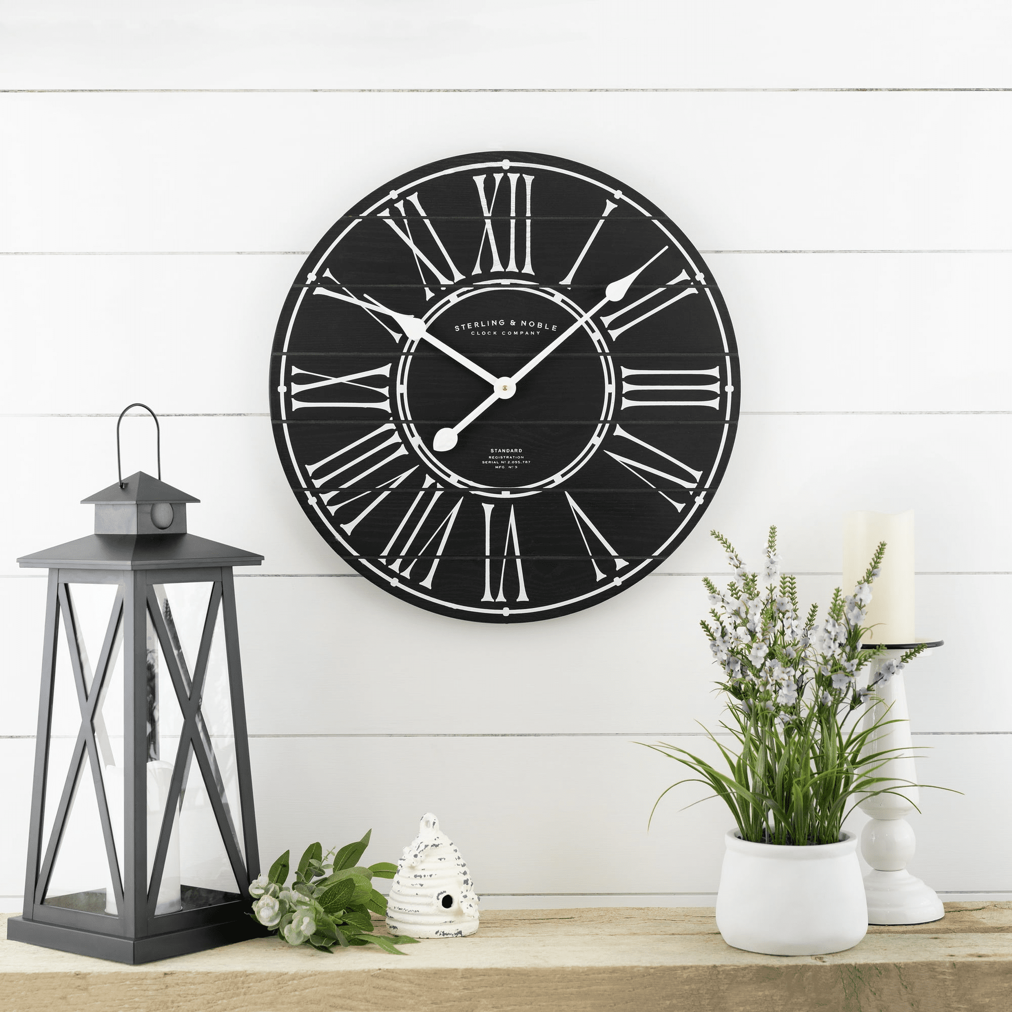 Update your home space with this beautiful better homes & gardens indoor 20' white roman numeral and frameless black shiplap farmhouse analog wall clock! This clock features a frameless style, with a horizontal shiplap dial. The white roman numerals and minute tracks are silkscreened onto the shiplap dial. Classic teardrop hour and minute hands are finished in white, making them easily visible against the dark dial. Quality quartz movement ensures accurate timekeeping. The large format of this 20' diameter wall clock makes an impacting decorative statement! The stark black and white color palette gives this timepiece a modern edge, while the tongue-and-groove style shiplap keeps it comfortable and casual. Whether hung upon a wall in your living room, bedroom or entryway, this stylish wall clock is sure to complement your home!