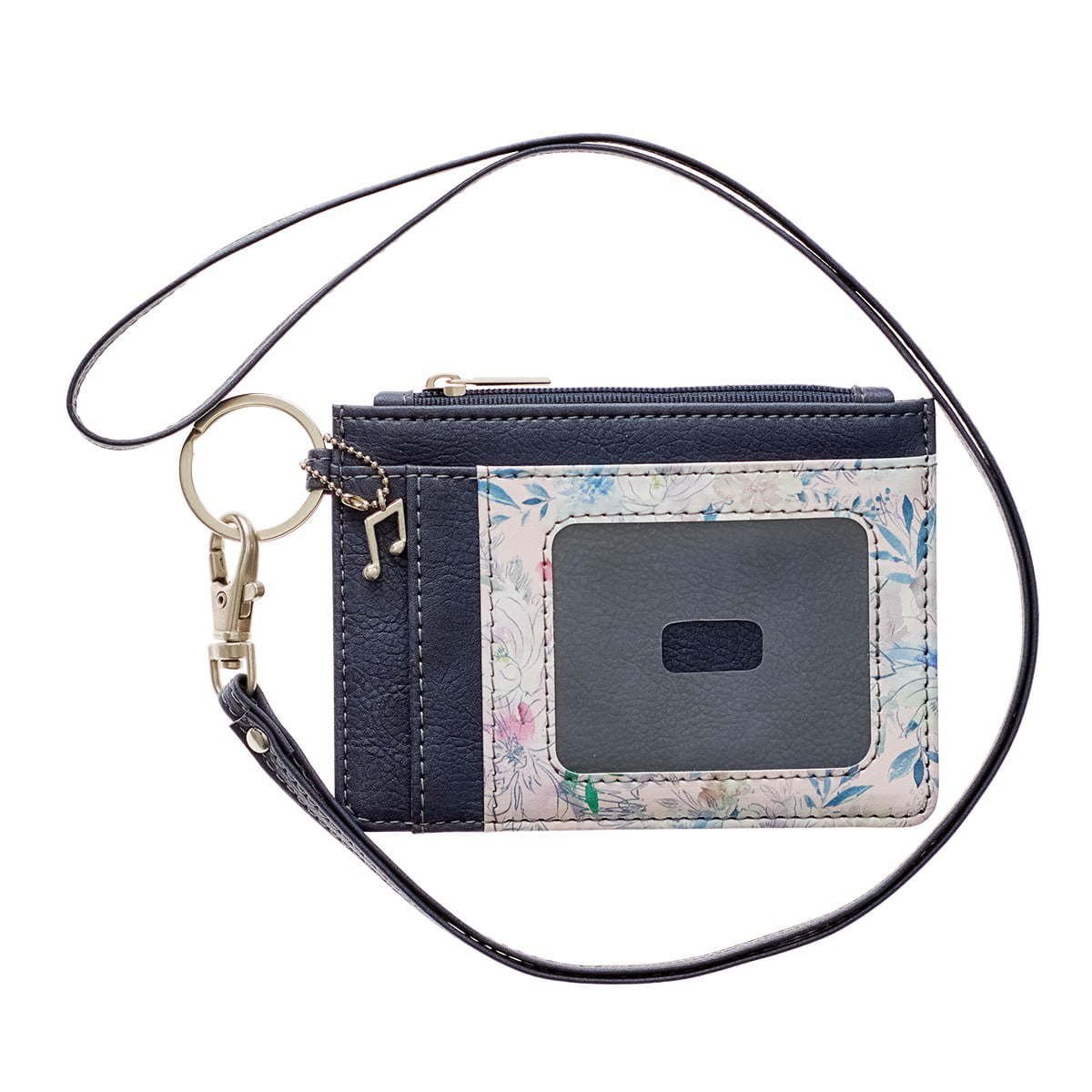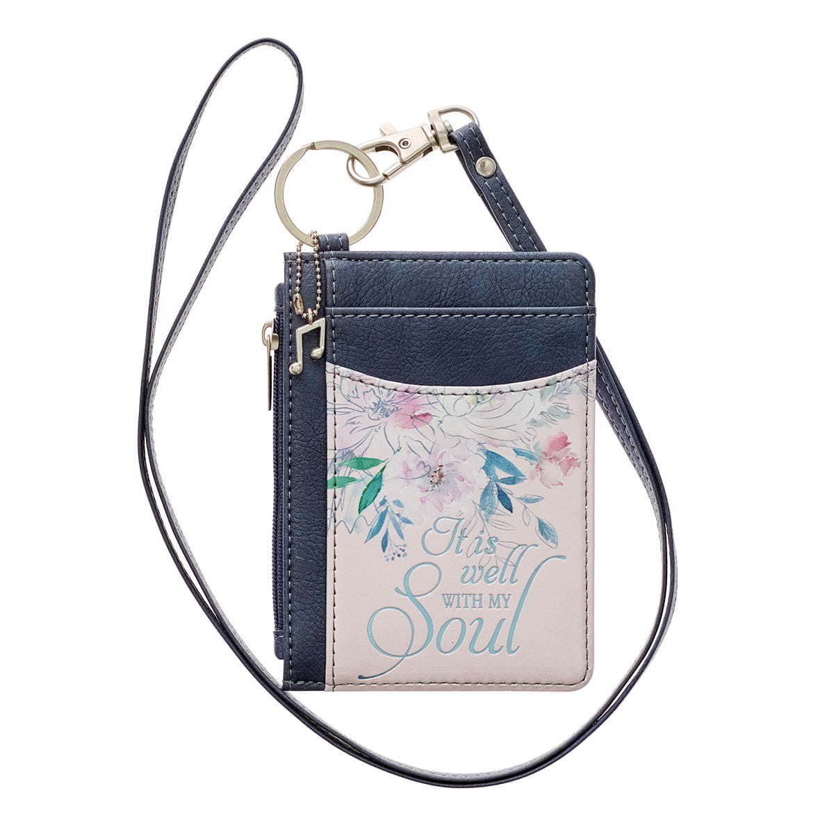 With its peace-filling message, the Well With My Soul Hymn Soft Pink and Blue Faux Leather ID Card Holder will be your prompt throughout the day that your peace does not come from this world but that it is a heavenly gift from the Father. Soft, watercolor flowers cascade down against a soft pearlized pink front slip pocket of the faux leather ID holder. Below the falling flowers, the sentiment, taken from the classic hymn, is written in an elegant blue foiled cursive script.It is well with my soul Blue-toned gray faux leather constructs the rest of the body, as well as the detachable strap. This ID pocket comes with several handy compartments: 3 credit card slots, 2 multi-purpose slip pockets, and a clear ID window—so that you keep all your cards, receipts, and cash organized. The fabric-lined zippered pocket is perfect for stashing loose change or coupons. A silver split ring connects the detachable strap and features an attached silver music note charm