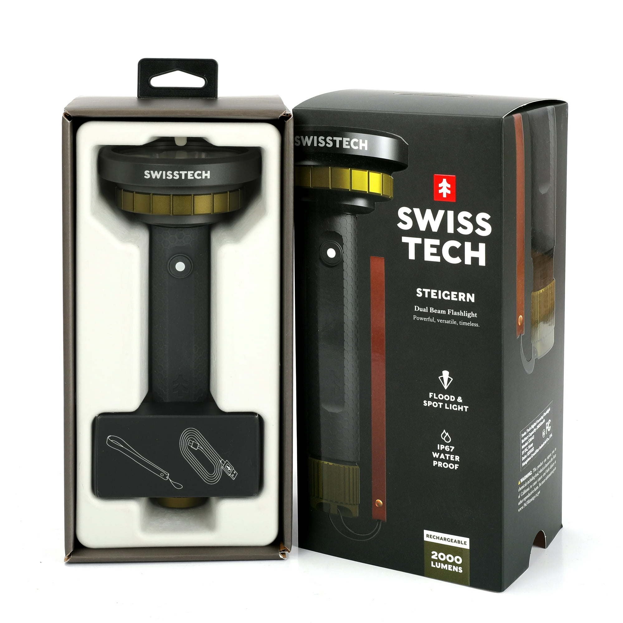 The Swiss Tech Steigern LED Rechargeable Flashlight is a premium hand held and compact classic for every home. This ultra-bright flashlight features 2000 Lumens of light output on high, and has digital spot and flood focusing modes. Press and hold the power button to adjust brightness and beam focus. The Steigern is a striking IPX7 weather and water proof device so you are prepared for any situation your adventures throw at you. Designed specifically with your comfort in mind, the flashlight handle has a rubberized grip with a premium honeycomb texture. Whether you're hitting the trails or preparing your home, the Swiss Tech Steigern flashlight brings the style and functionality you need and want.