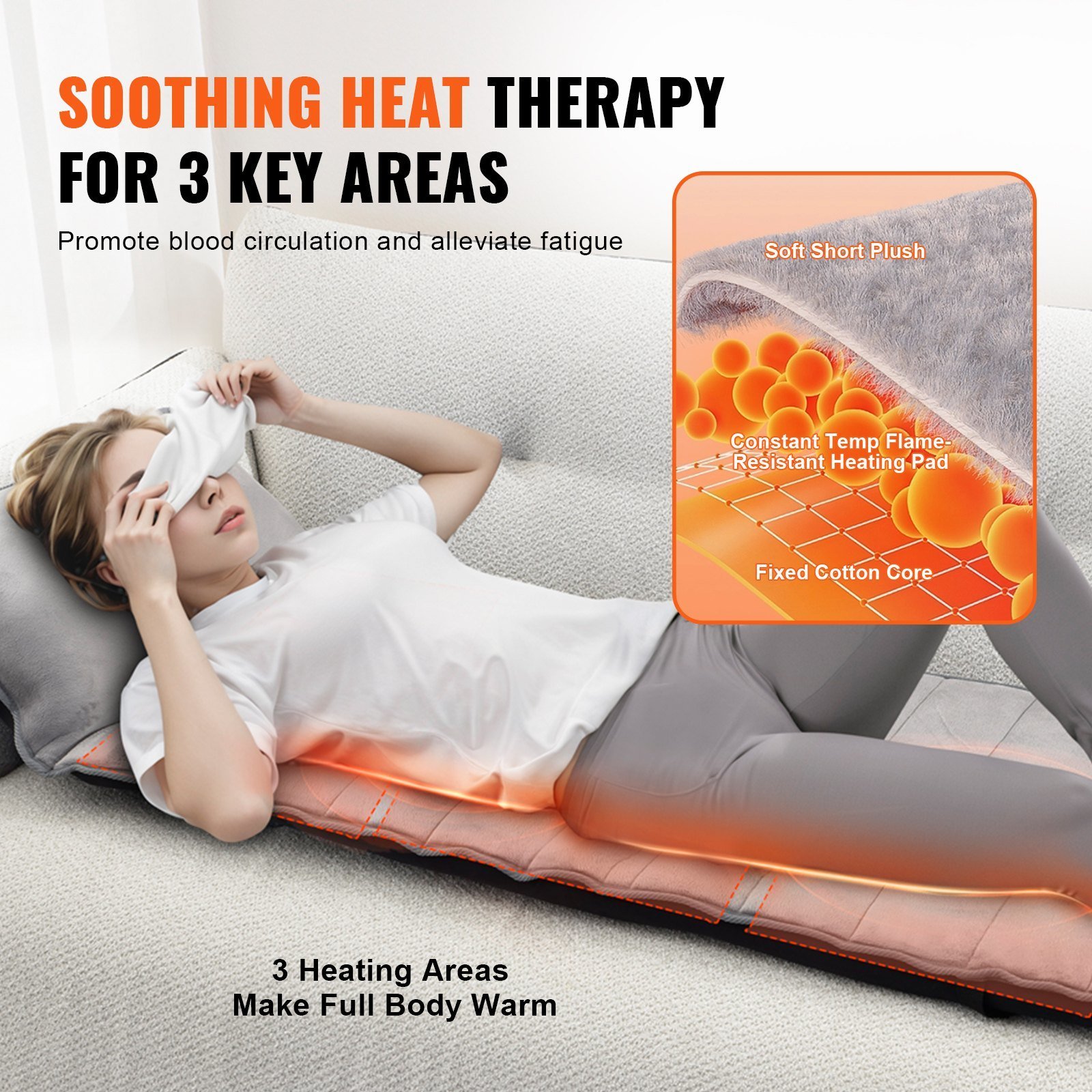 1.Professional Full-Body Massage: VEVOR full-body massage cushion comes with 10 vibration massage motors, covering your entire body to provide a soothing and relaxing massage experience. It targets both superficial and deep layers of your muscles, relieving tension and soothing aches to bring about overall body relaxation.
