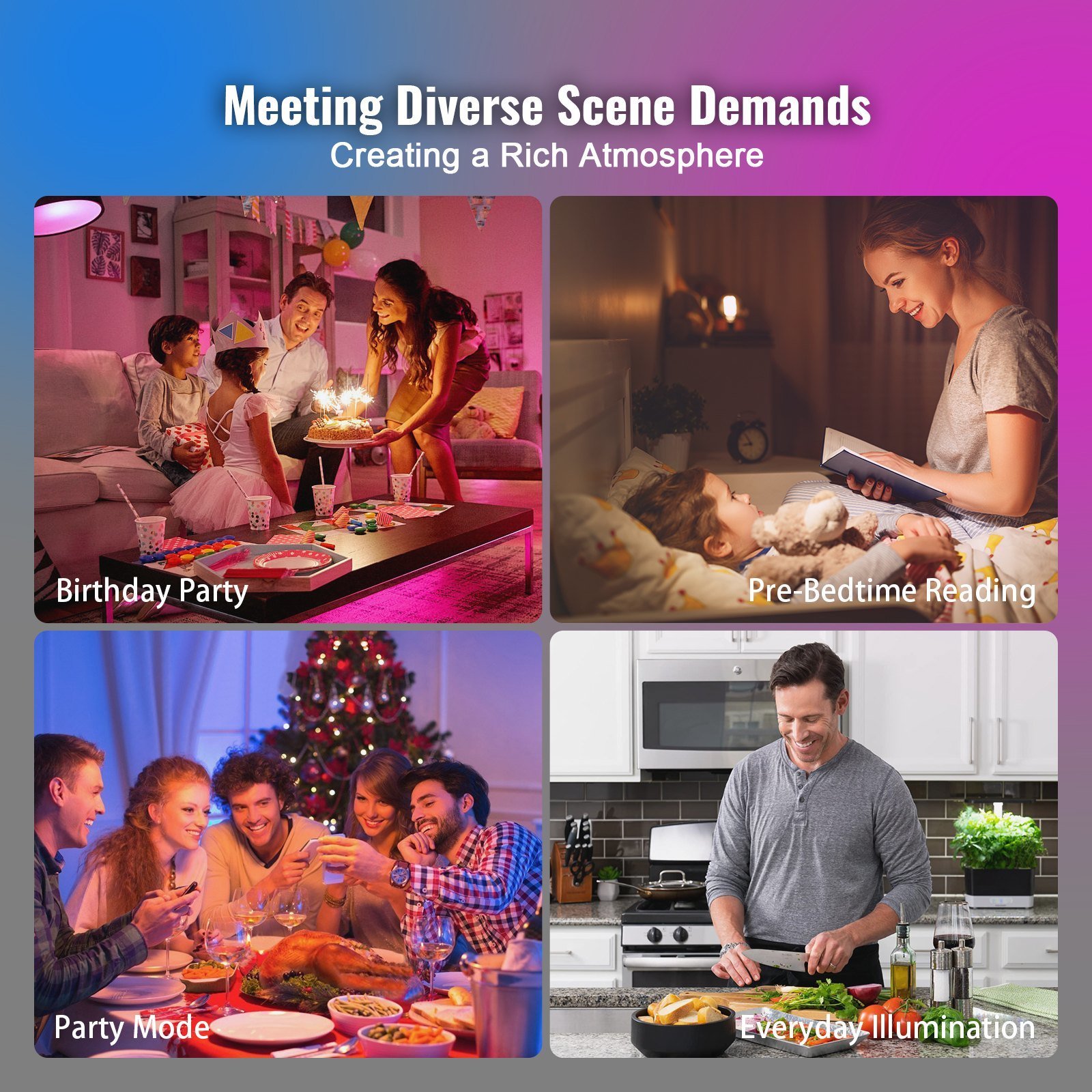 Scheduled Scenes and Timetables: Utilize the timer function and modes such as sunrise and sunset to preset your light bulbs. You can set them to brighten gradually when you wake up and dim gradually as you go to sleep. Choose from preset scenes to decorate your home according to different holidays.